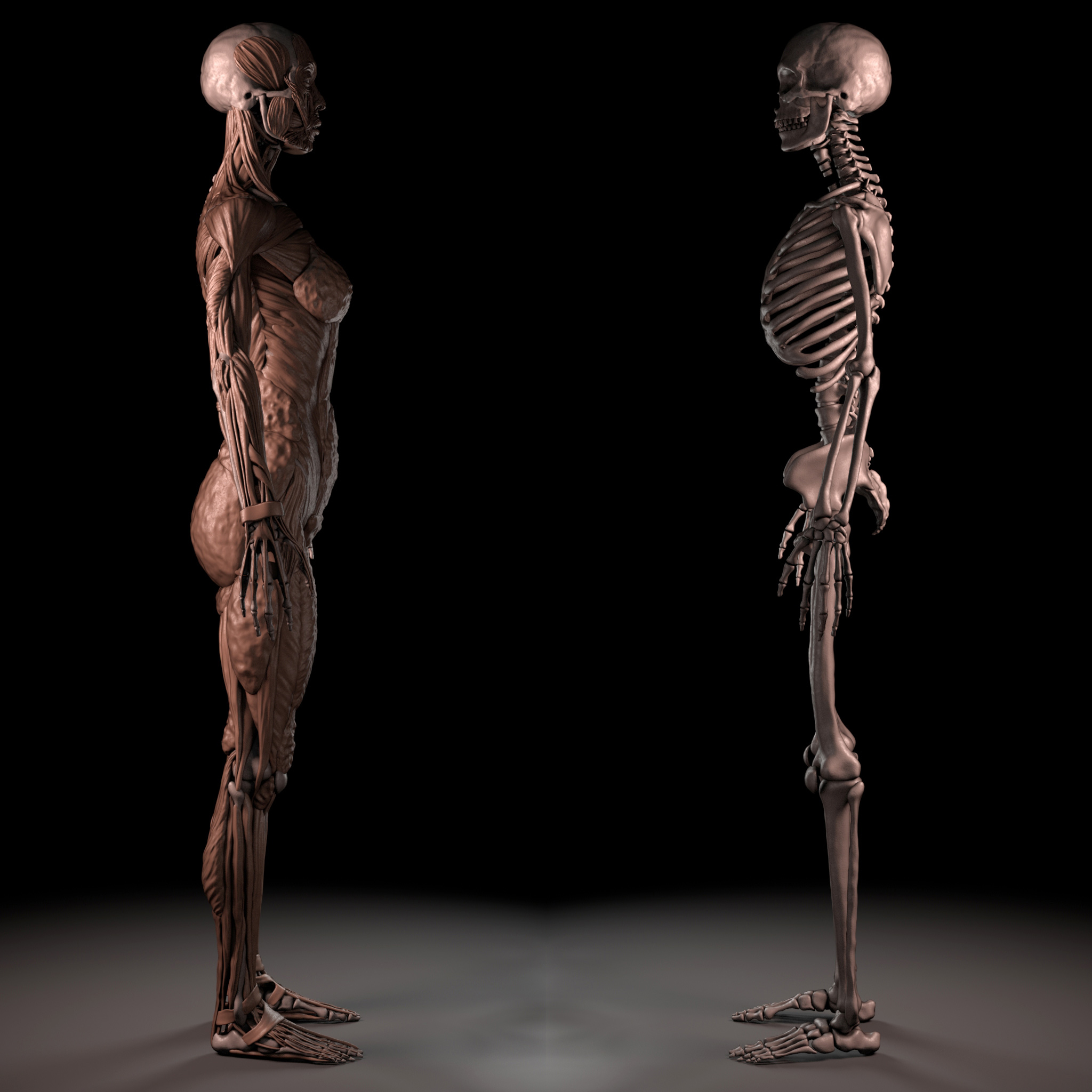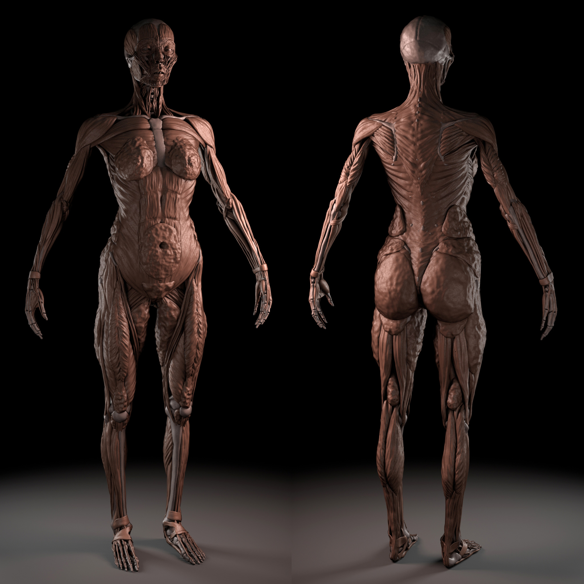 Human form has always been a challenge to artists and learning anatomy is crucial for any artist. The more you understand, the more you can draw or sculpt from imagination. I looked at the artistic anatomy books, medical anatomy books, human dissection videos, and any magazine or article that could I find. All this to help further my knowledge of the human figure. I started from the ground up, first sculpting the skeleton then muscles and finishing with the fat pads. Sculpting was done in Zbrush and then taken to Maya for rendering.