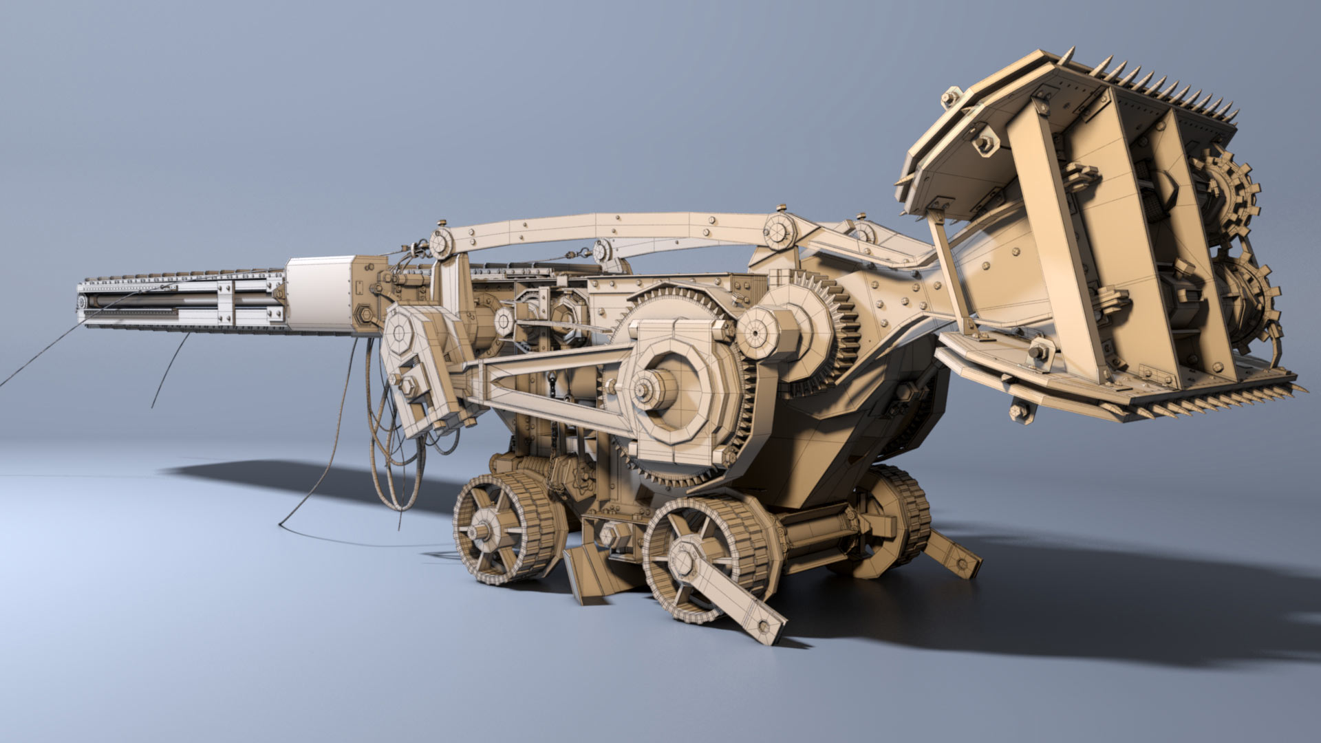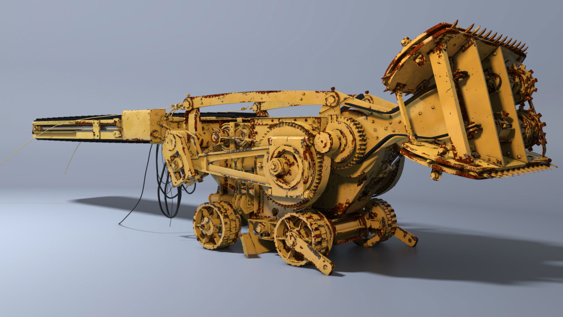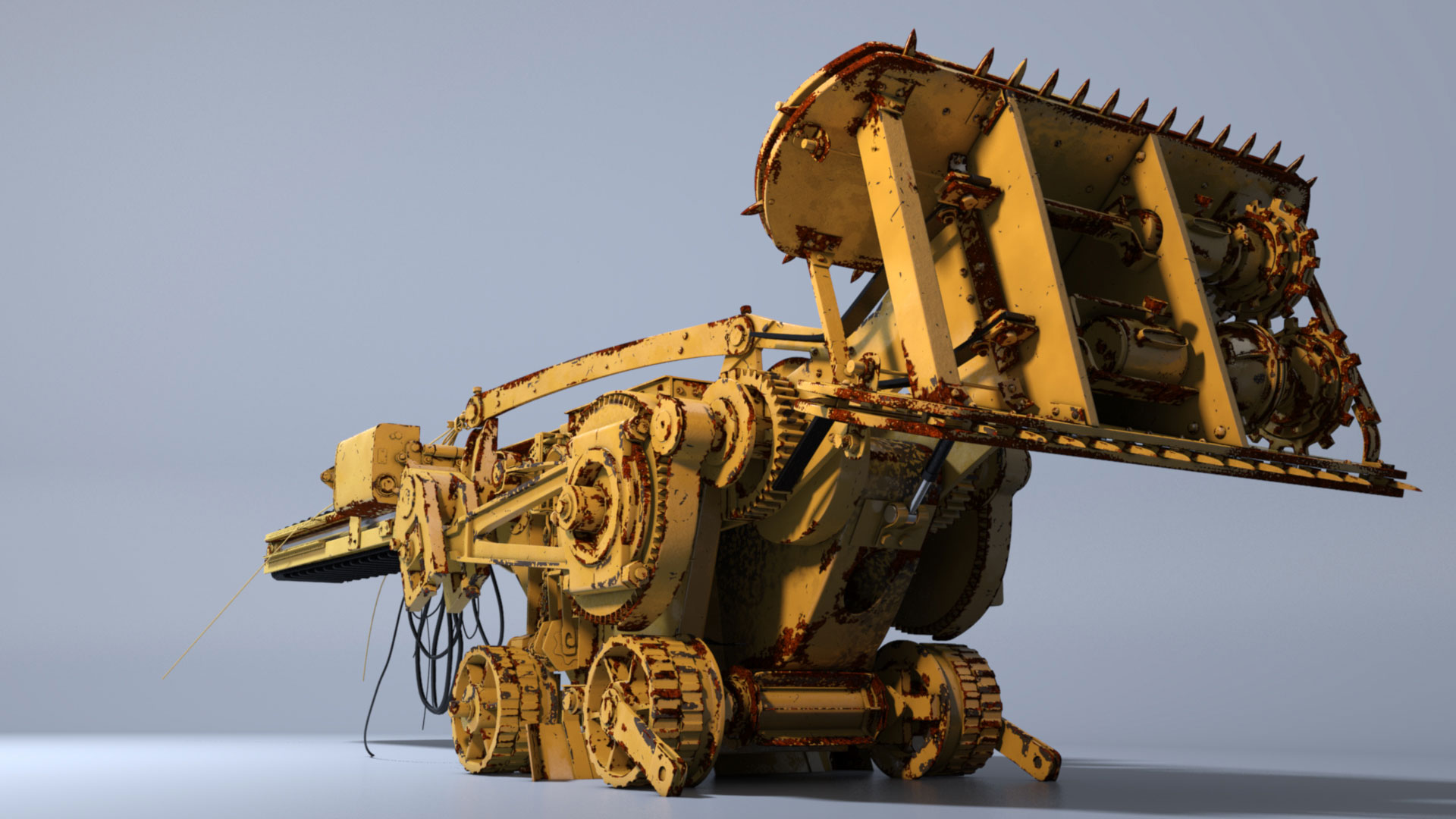 The coal grinder was done in 3Ds Max and rendered with Mental Ray. This model was a challenge as I had only one image and that angle to model from. I used color and texture information from CAT vehicles. All textures where done procedurally.